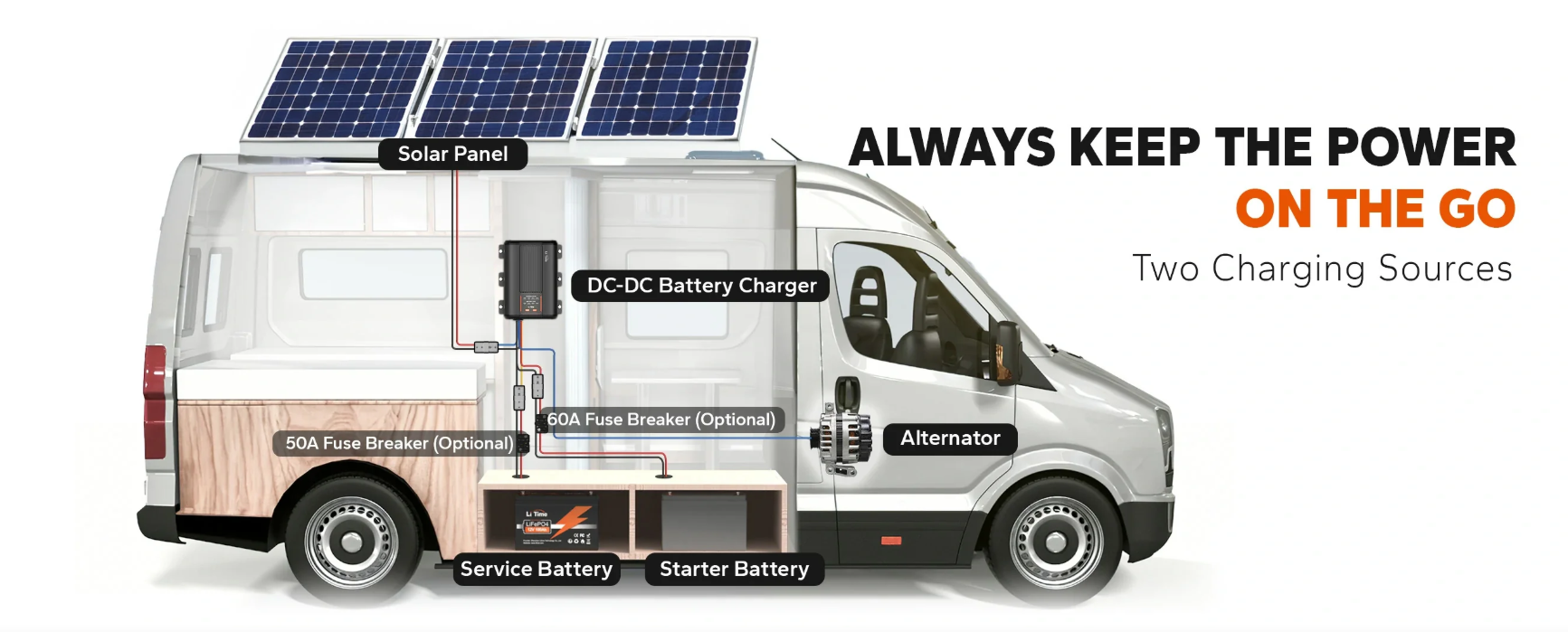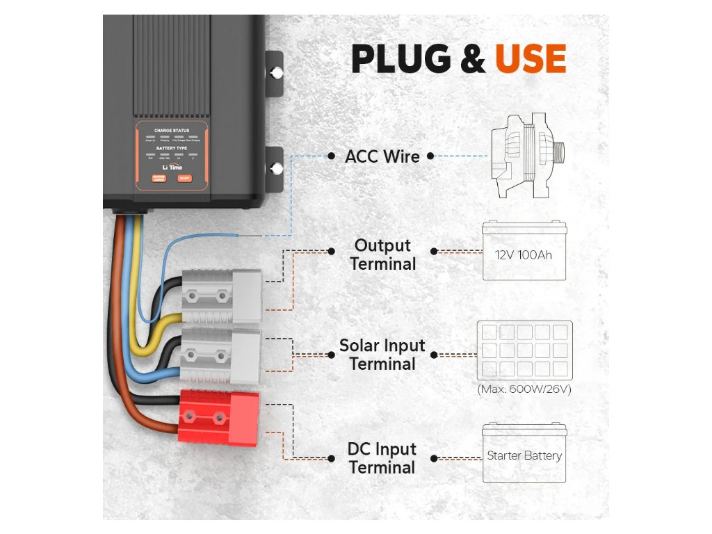 S nabíječkou baterií LiTime 12V 40A DC-DC si můžete být jisti, že vaše potřeby napájení budou uspokojeny, ať jste kdekoli. Tento systém je navržen pro všestrannost a umožňuje použití dvou zdrojů nabíjení, aby vaše servisní baterie zůstala nabitá a připravená k použití.