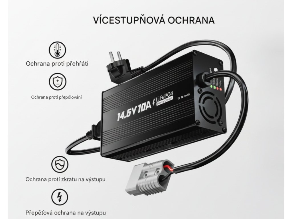 LiFePO4 baterie vyžadují jiný nabíjecí režim než olověné nebo AGM baterie. Nabíječka s výstupním napětím 14,6 V odpovídá doporučeným parametrům výrobce a umožňuje plné a bezpečné nabití baterie bez zbytečného přetěžování.
