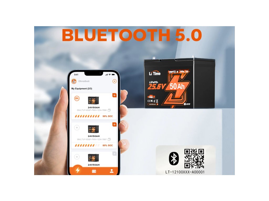 Inteligentní lithium-železo-fosfátová baterie LiTime 24V 50Ah TM má vestavěný vylepšený inteligentní systém BMS, integrovaný Bluetooth 5.0 , na horní straně baterie je umístěna samolepka s kódem Bluetooth QR, naši baterii s hlubokým cyklem lze připojit k telefonu naskenováním kódu, není třeba kód párovat, snadno se ovládá a funkce Bluetooth umožňuje sledovat a spravovat stav baterie přesně a snadno v reálném čase prostřednictvím aplikace LiTime APP.