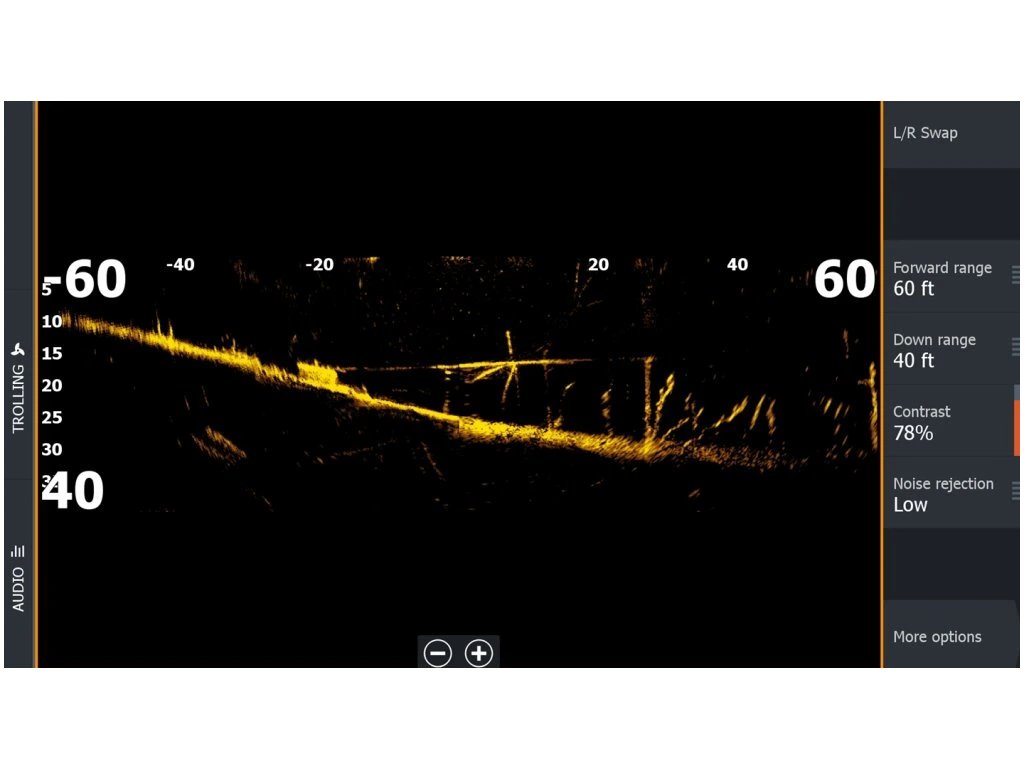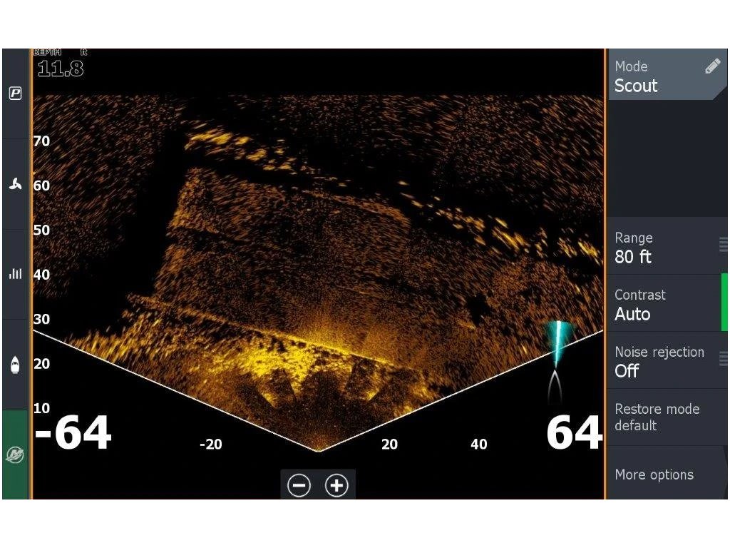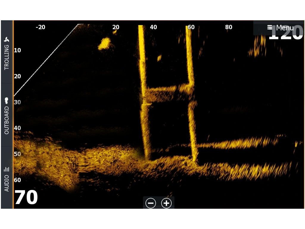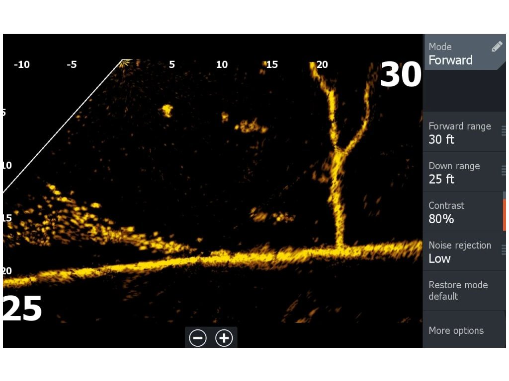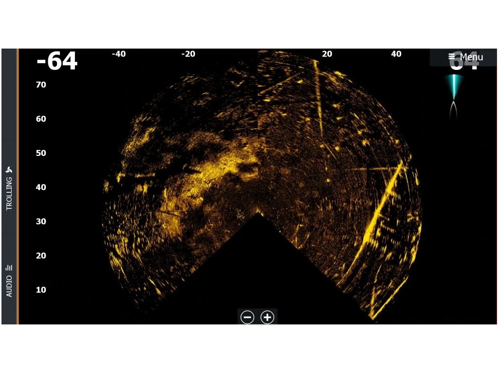 Zobrazuje struktury a rybí cíle, které se nacházejí před sondou.